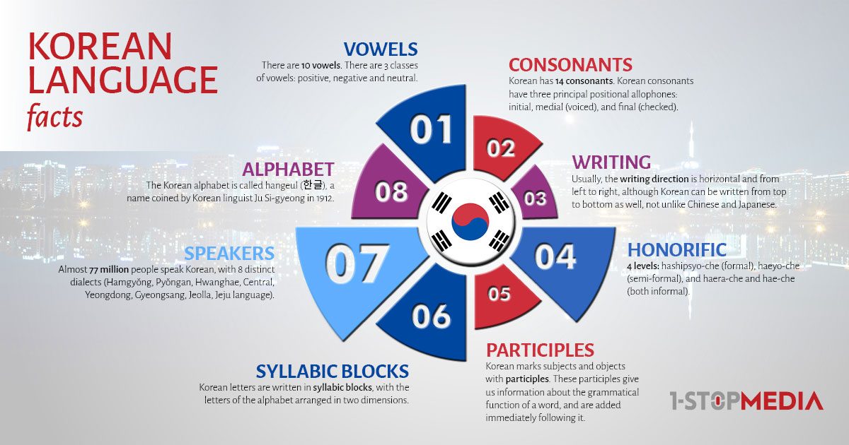 Korean, the national language of South and North Korea, is one of the world’s oldest living languages. It is very similar to Japanese in terms of grammar, and over 70% of its vocabulary is “borrowed” from Chinese. Korean language has a very sophisticated honorific system, which can be challenging for translators and foreigners to master.